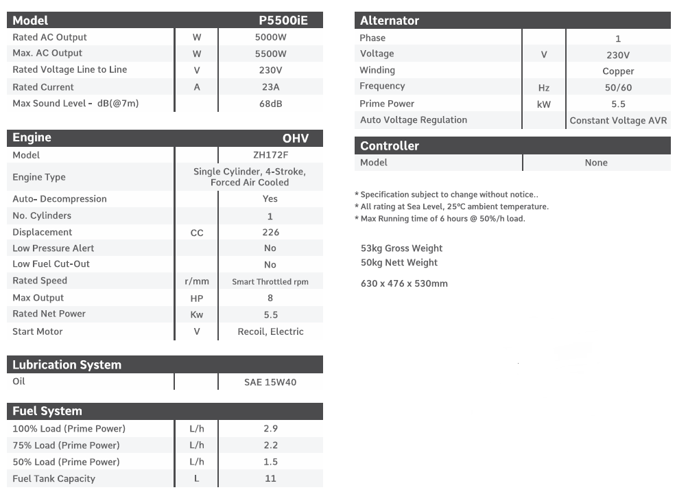 *All rating at Sea Level, 25 degrees Celcius ambient temperature